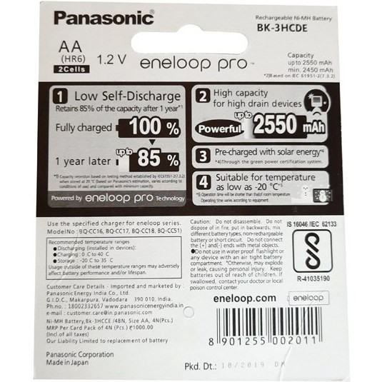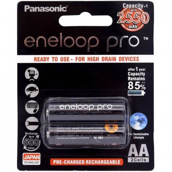 شامل دو عدد باتری قلمی (AA) با میزان ولتاژ 1.2 ولت، دارای طول عمر 500 بار شارژ مجدد